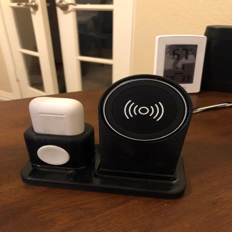 A dock to hold and charge air pods, apple watch and iPhone with wireless charging. PLA + Size 140 x 68 x 112 mm