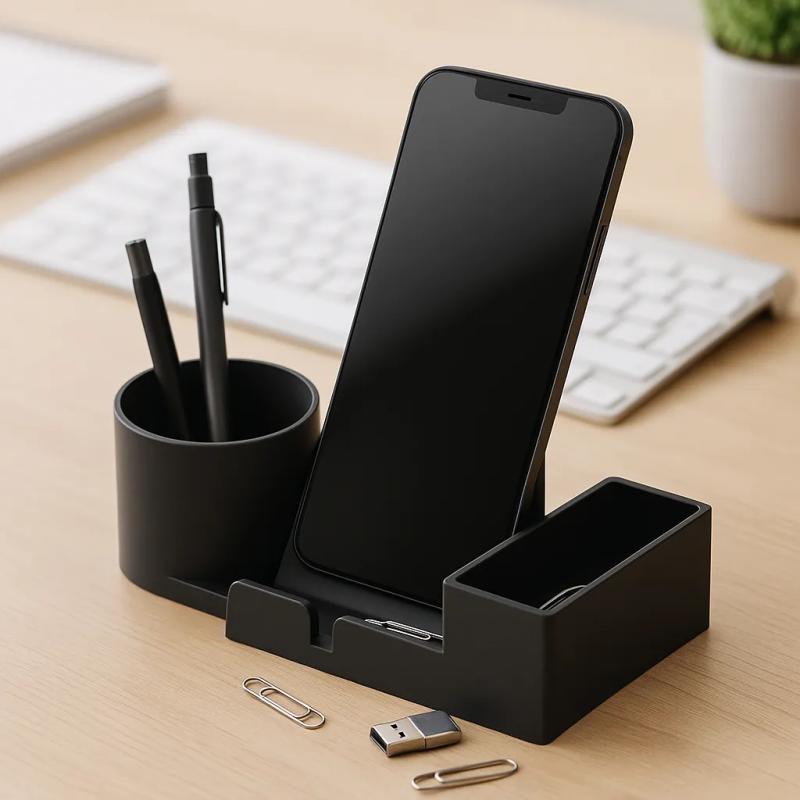 Phone stand fits most smartphones with tray for USB drives, paper clips & small accessories. Material PLA+. Size 180x90mm.