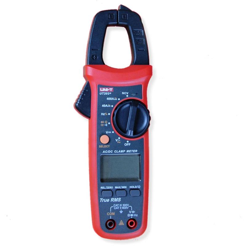 The UNI-T UT203+ Digital Clamp Meter is designed in compliance with EN61010-2010 CAT II 600V / CAT III 300V standards, offering overload protection, high reliability, safety, and accuracy. This True RMS clamp meter measures AC/DC voltage, AC/DC current, resistance, capacitance, frequency, duty cycle, and continuity, and also includes diode testing functionality, making it a versatile tool for electrical diagnostics.