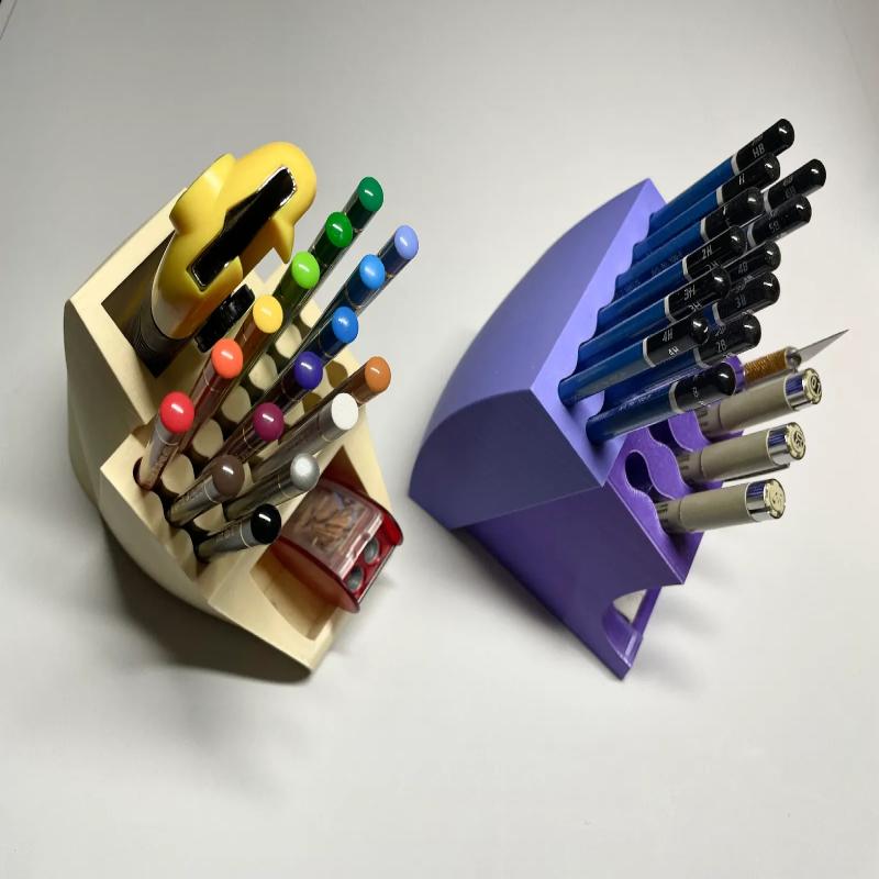 Two office utensil organizers designed for pencils, micron pens, an eraser, and a box cutter. Use however you see fit. PLA + Size 99 x 177 x 130 mm
